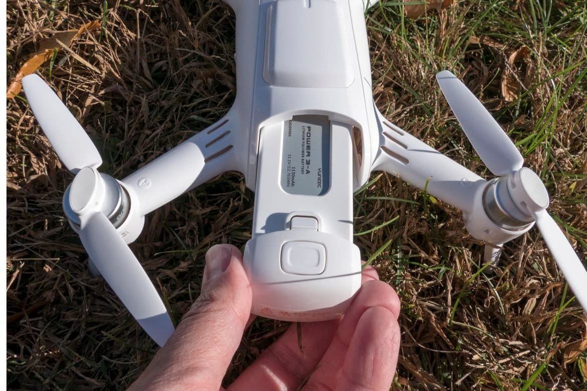 A sleek white quadcopter drone lies on grassy terrain, highlighting advanced drone features and easy portability for aerial filming and recreational use.