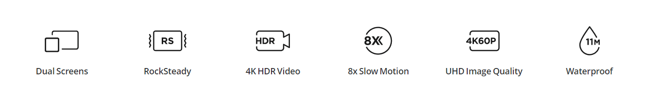 Sophisticated tech features including dual screens, RockSteady stabilization, 4K HDR video, waterproof build, and 8x slow motion for premium user experience and content creation.
