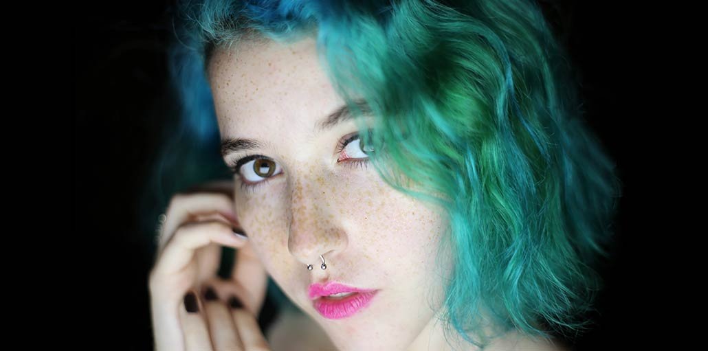 Close-up portrait of a young woman with vibrant green and blue curly hair, freckles, and pink lipstick, highlighting modern beauty trends and expressive style for fashion campaigns.